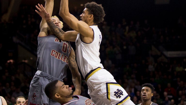 Boston College: The Eagles used nine players in the first half but got only three points from its bench, which outnumbered Notre Dame’s reserves 13-3. The Eagles shot just 29.4 percent in the first half (10 of 34) and were outrebounded 24-22.
