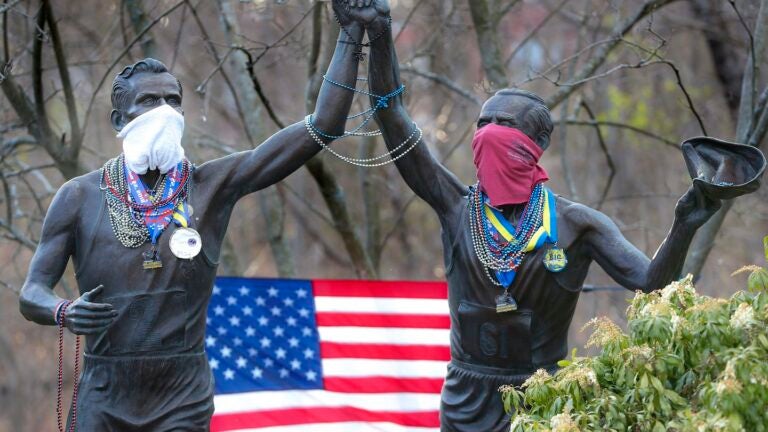As of Monday, nine runner statues in five states were wearing protective masks, including three in Hopkinton and one in Newton.