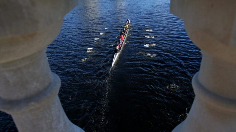A coxed four men’s crew passes from under Week’s Bridge. – Michael Swensen for The Boston Globe