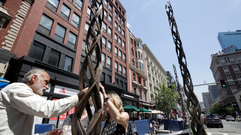 The spires, ranging in height from about 17 feet (5 meters) to 21 feet (6 meters), will serve as light poles for the memorial. They were installed Wednesday at one of the two locations where pressure cooker bombs detonated on April 15, 2013, killing three people and wounding more than 260 others.