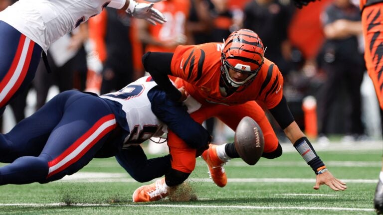 White’s first sack came when he was matched up against former Patriot Trent Brown. White lined up standing on the outside and got a running start before hitting Brown with an inside move and chasing down Bengals quarterback Joe Burrow from behind. White used his speed to his advantage to beat the taller, heavier Brown.
