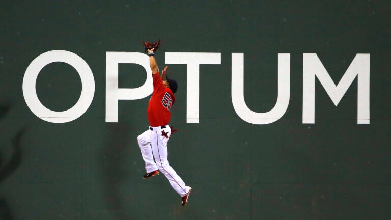 Watch Mookie Betts crash into Green Monster while making spectacular leaping catch