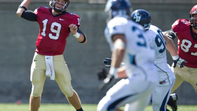 Or minutes after shedding his soaked Crimson uniform last Friday night, when he fired four touchdown passes through the driving rain and a beleaguered Holy Cross defense in the first half of a 52-3 rout.