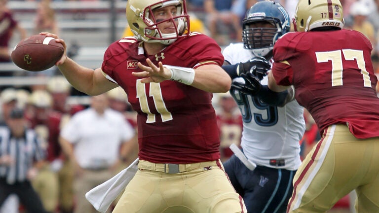 His Eagles trailed Villanova, a top-10 preseason pick in the Football Championship Division, 14-7, at the half, before punching in a pair of third-quarter touchdowns on the way to a hard-earned 24-14 victory in BC’s 115th season opener before 30,922 at Alumni Stadium Saturday afternoon.
