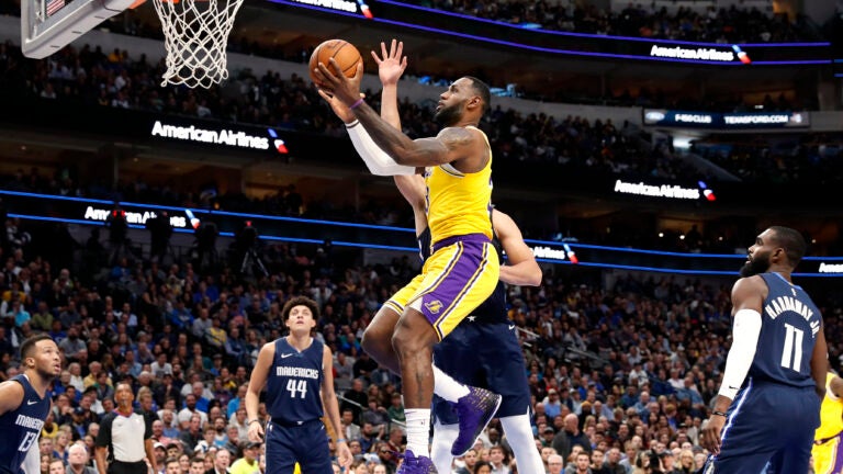 The Lakers star took an extra peek toward the national TV crew at center court, perhaps to gauge the entertainment value of the first matchup of the 15-time All-Star alongside Anthony Davis against Dallas’ young European pair of Luka Doncic and Kristaps Porzingis.