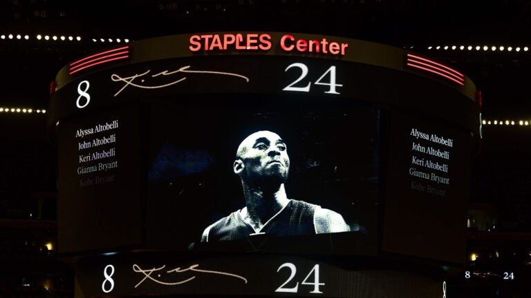 Red roses adorned the courtside seats where Bryant and his daughter sat at the last Lakers game they attended earlier in the season. On the overhead video board, photos of Bryant in action for the Lakers alternated with those of the others killed.