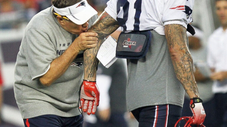 It hasn’t all been fighting in Foxborough. During Wednesday night’s practice in Gillette Stadium there was a tender moment between Belichick and tight end Aaron Hernandez.