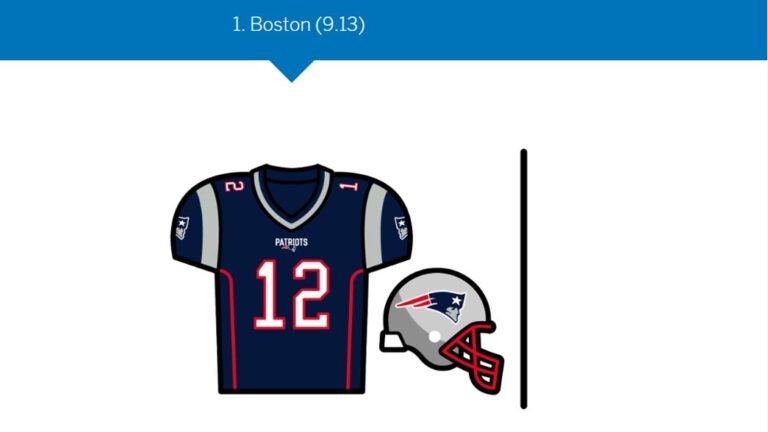 The Patriots’ uniforms ranked the lowest (7.5 out of 10) despite the team’s handsome quarterback, followed by the Red Sox (8), Celtics (8.5), and Bruins (9.5).