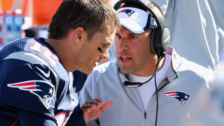 FOXBORO, MA - SEPTEMBER 27: Josh McDaniels, offensive coordinator for the New England Patriots congratulates Tom Brady #12 of the New England Patriots after his 400th career touchdown pass during the first half against the Jacksonville Jaguars at Gillette Stadium on September 27, 2015 in Foxboro, Massachusetts. (Photo by Maddie Meyer/Getty Images) Getty Images