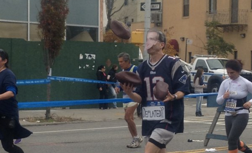 The man referred to as “The Joggler,’’ according to The Baltimore Sun, runs marathons while juggling objects. During the New York City Marathon on Sunday, his objects of choice were deflated footballs. To complete the getup, he wore a Tom Brady jersey and mask.