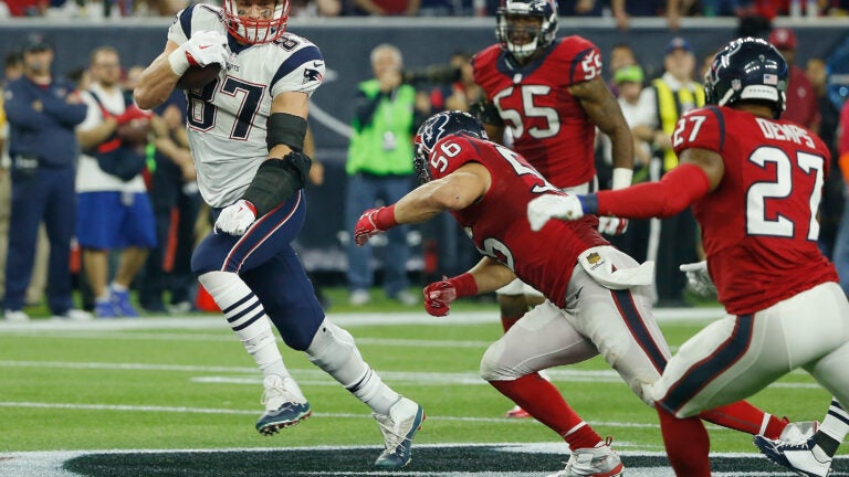 Rob Gronkowski was questionable to play ahead of Sunday, but the big-bodied tight end was in uniform making big plays against the Texans. He finished the night with four receptions for 84 yards and a touchdown. Gronkowski has now caught 10 touchdowns this season, the fifth time in his six-year career he has reached the mark. The Patriots finally have their monstrous tight end back, and his presence helped in more ways than one. He was opening holes as a blocker, drawing coverage away from his teammates in the passing game, and doing all the usual, physically dominant Gronk activities.