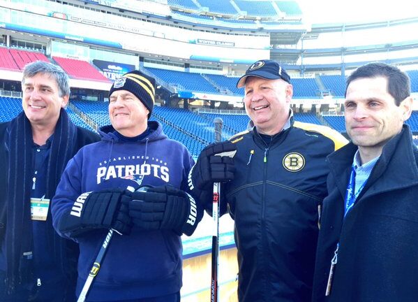 Belichick went skating with Bruins coach Claude Julien on The 2016 Winter Classic rink at Gillette Stadium. According to Steve Conroy of the Boston Herald, Belichick took a spill during the coach-on-coach session. But judging from the huge grin on Belchick’s face in the photo with Julien and Bruins general manager Don Sweeney, the Patriots coach appeared to enjoy himself.