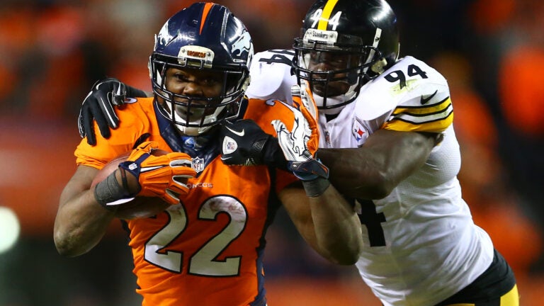 Jan 17, 2016; Denver, CO, USA; Denver Broncos running back C.J. Anderson (22) runs against Pittsburgh Steelers inside linebacker Lawrence Timmons (94) during the fourth quarter of the AFC Divisional round playoff game at Sports Authority Field at Mile High. Mandatory Credit: Mark J. Rebilas-USA TODAY Sports USA Today Sports