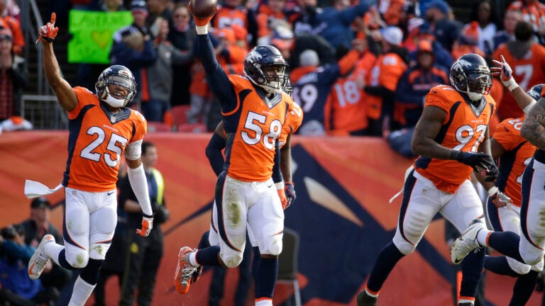 With 14:38 to go in the second quarter, Brady tried to get the ball to Rob Gronkowski, but was picked off by Denver linebacker Von Miller.