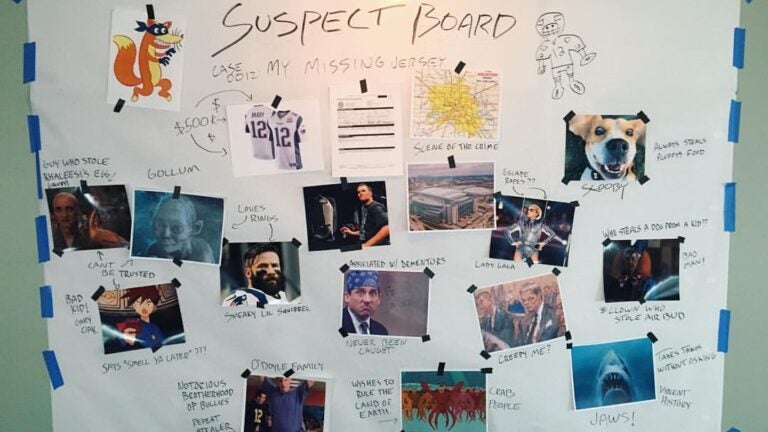 The board features 13 persons (and animals) of interest as well as the HPD police report and a map representing the scene of the crime. Notable potential suspects include Gollum and teammate Julian Edelman for their love of rings and Jaws for its violent history.
