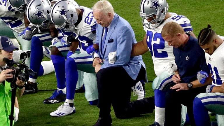 Lockhart said the league was proud of the displays from the Cowboys and Cardinals on Monday Night Football. The entire Cowboys team, including owner Jerry Jones, took a knee before the playing of the national anthem, then stood together with locked arms during the anthem. Cardinals plays also locked arms for the national anthem.