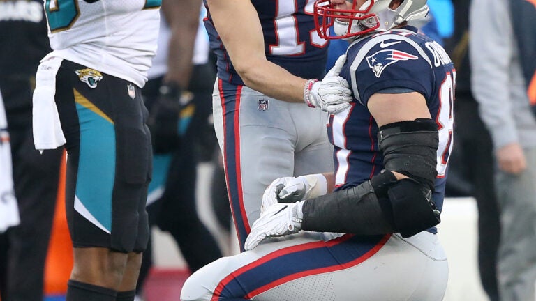 Patriots tight end Rob Gronkowski was immediately escorted to the locker room after suffering a helmet-to-helmet hit from Jaguars safety Barry Church.