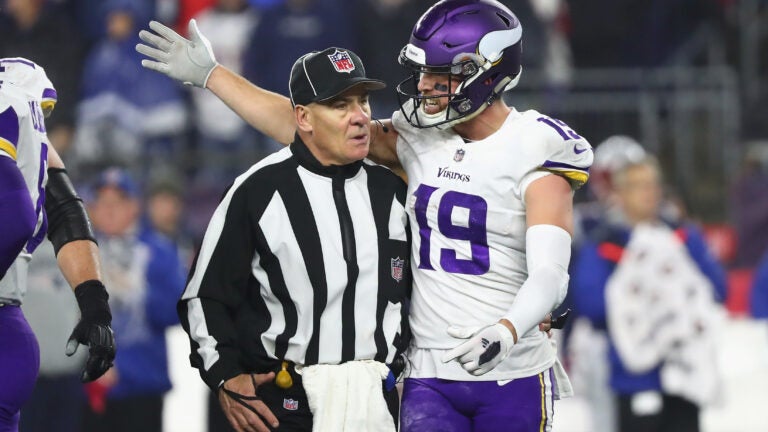 ■ 11. Thielen started yelling at Bill Belichick for some reason after the coach threw his red flag to challenge a spot midway through the fourth quarter. Maybe Belichick told him his earlier touchdown celebration was pathetic. It appeared Belichick responded by something along the lines of “Kindly cease commiserating, good sir’’ to Thielen there. But I’m not a lip-reader.
