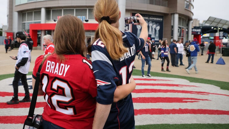 Fans cheer and take pictures of Tom Brady as he runs onto the field of Gillette Stadium prior to the game. Credit: AP Photo/Elise AmendolaDueling signs for Mac Jones and Tom Brady. Credit: AP Photo/Elise AmendolaTwo fans pose for a selfie wearing Bucs and Pats Brady jerseys. Credit: Matthew J. Lee/Globe Staff – Photo by Matthew J. Lee/Globe StaffTwo fans wear the combined Buccaneer and Patriots jerseys of Rob Gronkowski and Tom Brady. Credit: Matthew J. Lee/Globe StaffA young fan holds a “Thanks T. Brady” sign outside Gillette Stadium. Credit: Matthew J. Lee/Globe StaffTwo Patriots fans hang a welcome banner at their tailgate for Brady. Credit: Matthew J. Lee/Globe StaffA pair of sisters wear Brady jerseys, one from New England and one from Tampa. Credit: AP Photo/Barry WilnerFans cheer for Brady at Gillette Stadium during pre-game warmups. Credit: Jim Davis/Globe StaffPatriots fans held up signs and chose to support their home team over the GOAT during the game. Credit: Jim Davis/Globe Staff