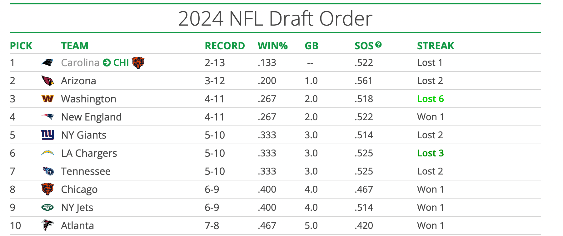Even though the Patriots and Commanders are technically tied with the same 4-11 record, Washington holds the slight edge due to strength of schedule (SOS). The first tiebreaker for draft order is SOS, with the team holding the weaker strength of schedule handed the higher pick.