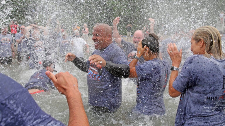 Clad in a T-shirt and shorts, Jackson jogged into the surf holding his wife Michelle’s hand before submerging himself. He popped up, pulled up his sagging swim trunks — but not before his backside was exposed — and then splashed along with owner Dee Haslam and more than 150 team employees who turned out to support him and raise money for his charity.