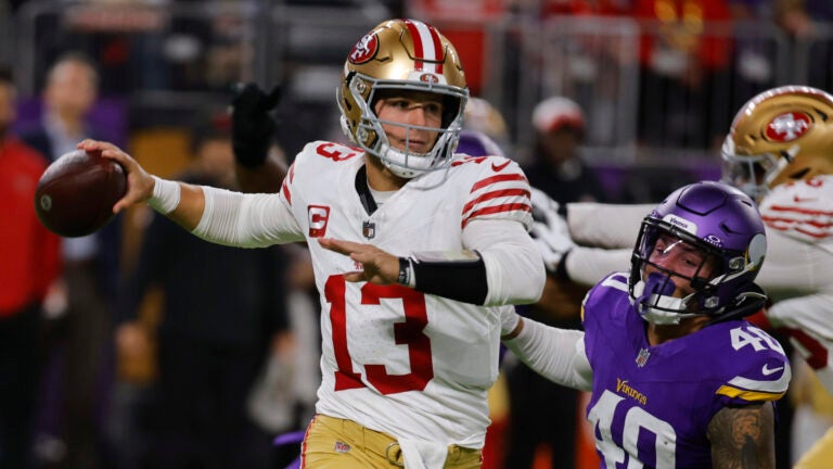 Purdy got hit in the helmet on a quarterback sneak in the fourth quarter against the Vikings. He remained in the game but threw two interceptions on his final six pass attempts in the 22-17 loss.
