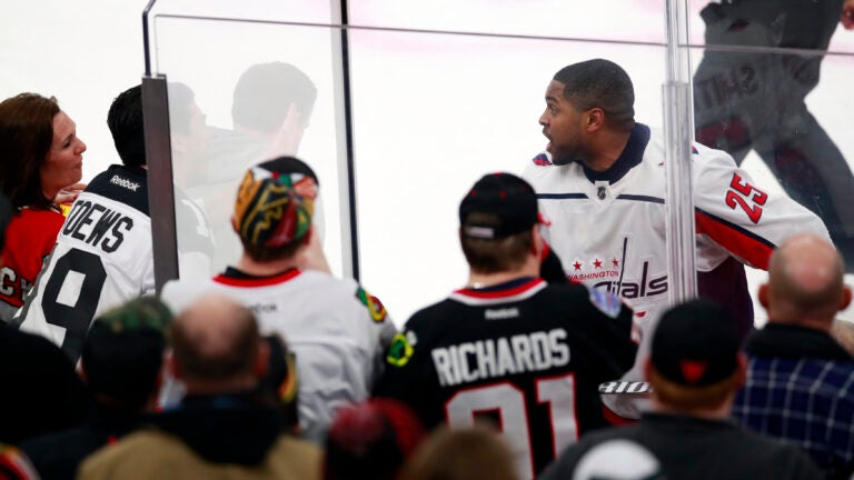 Washington’s Devante Smith-Pelly was serving a major penalty for fighting Chicago’s Connor Murphy when the fans taunted him in the penalty box. An off-ice official sitting next to him notified building security, and the fans were ejected.