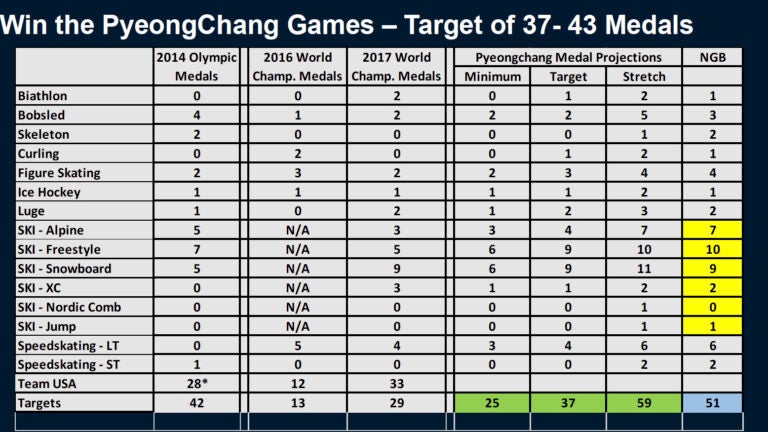 Under that same “stretch” scenario across all sports, the document said the U.S. could win 59 medals, which would’ve shattered its 37 medal haul in 2010, the all-time mark for any Winter team. It set a minimum goal of 25 medals.