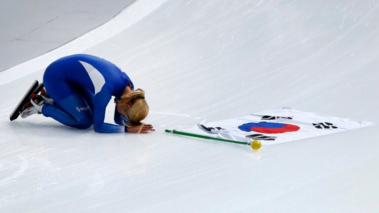 After the race, Kim skated around carrying the South Korean flag. She stopped at one end of Gangneung Oval, laid the flag on the ice, bowed to the crowd, dropped to her knees and placed her head on her hands.