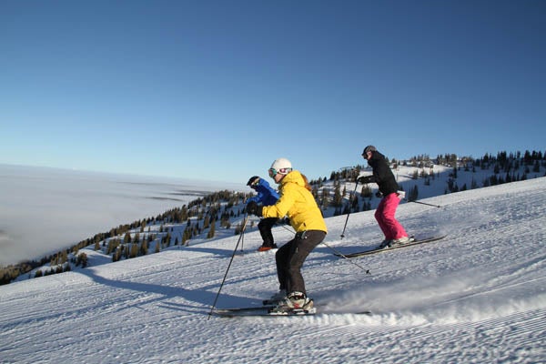 Sunday River rolls out a big white carpet for your family in Maine along with eight interconnected peaks and the most advanced snowmaking and grooming in the biz. The River’s Perfect Turns program will have your small fry making French fries in no time. Two on-mountain hotels bookend Sunday River’s 870 acres of terrain, and each has an inviting outdoor heated pool and hot tub. The resort puts on an array of events, including fireworks and evening dining at North Peak (via the Chondola) with mascots Eddy and Betty the Yetis.