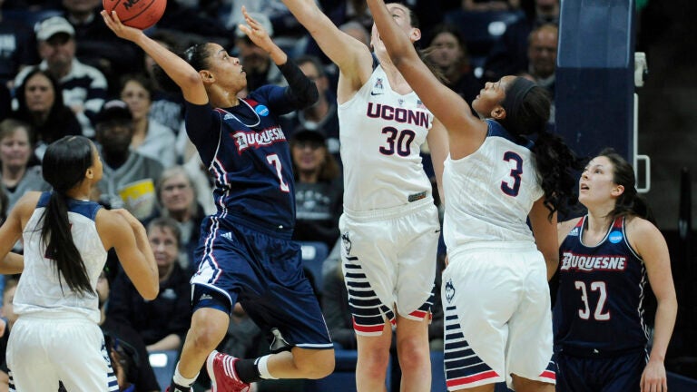 Down 20-14 in the first half, the Duquesne women’s basketball team tried their very best to get any shot they could to fall. Unfortunately for them, everywhere they turned, UConn’s Breanna Stewart was there to send it back, eventually triggering a shot clock violation.