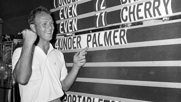 Palmer won the first three-way Masters playoff — beating defending champion Gary Player and Dow Finsterwald — for the third of his four titles at Augusta National. Palmer shot a 31 on the back nine to finish at 68 on Monday, three strokes ahead of runner-up Player. It was Nicklaus’ first appearance at the Masters as a professional.