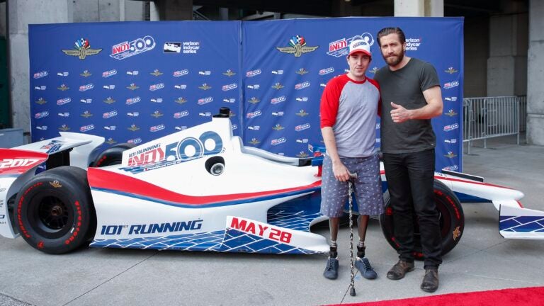 Jeff Bauman was on hand Sunday for the 101st running of the Indianapolis 500, along with actor Jake Gyllenhaal, who is portraying the Boston Marathon bombing survivor in the upcoming movie, Stronger.
