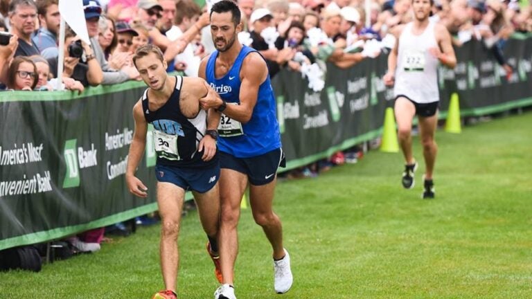 Former University of Maine runner Jesse Orach says he thought the race was over and then he felt someone pick him up Saturday. Robert Gomez, of Windham, helped Orach to his feet, and together they crossed the finish line. Then, Orach collapsed again.