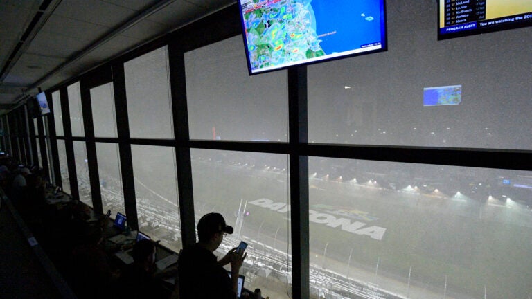 The first delay of the day came moments after the presidential motorcade completed a ceremonial parade lap around the 2 1/2-mile track. Trump’s armored limousine nicknamed “The Beast” exited Daytona International Speedway, and the sky opened for a brief shower that forced drivers back to pit road.