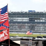 At Talladega, in the heart of the South, as many as 5,000 fans were allowed in, even though rain postponed the race until Monday and visitors were barred from the infield. No flags were spotted Sunday, but cars and pickup trucks driving along nearby roads were flying the flag and parading past the entrance to the superspeedway over the weekend. A small plane flew over the track Sunday pulling a banner with the flag and the words “Defund NASCAR.”