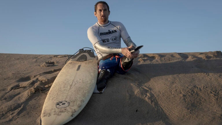 It’s a hell of a workout and pretty intimidating, especially when the waves are big, because I don’t have the weight to duck dive, which is when a surfer pushes his board down under the waves as he goes out. Because I don’t have legs, I can’t generate enough force to get the whole board under the water. That’s fine with me though, because any upper body work I do now is going to benefit me when I get back in the pool.