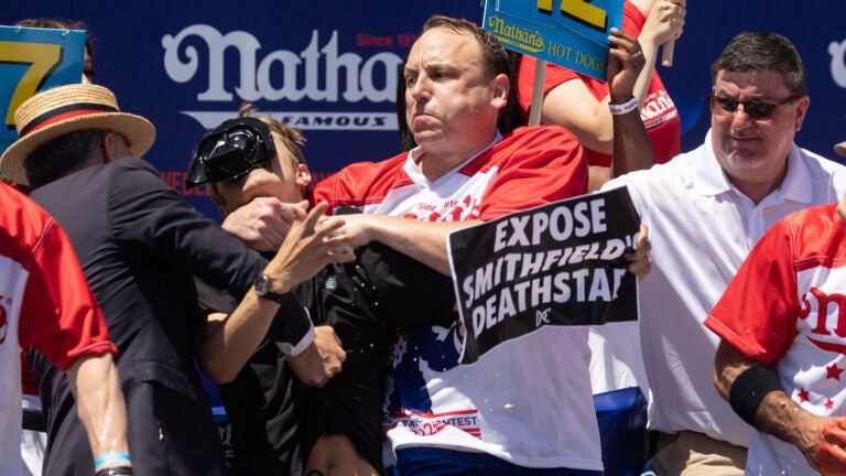 Another protester in a white stormtrooper mask had also snuck behind the competitors and hoisted a sign saying, “Expose Smithfield’s Deathstar.” Smithfield manufactures Nathan’s famous hotdogs.