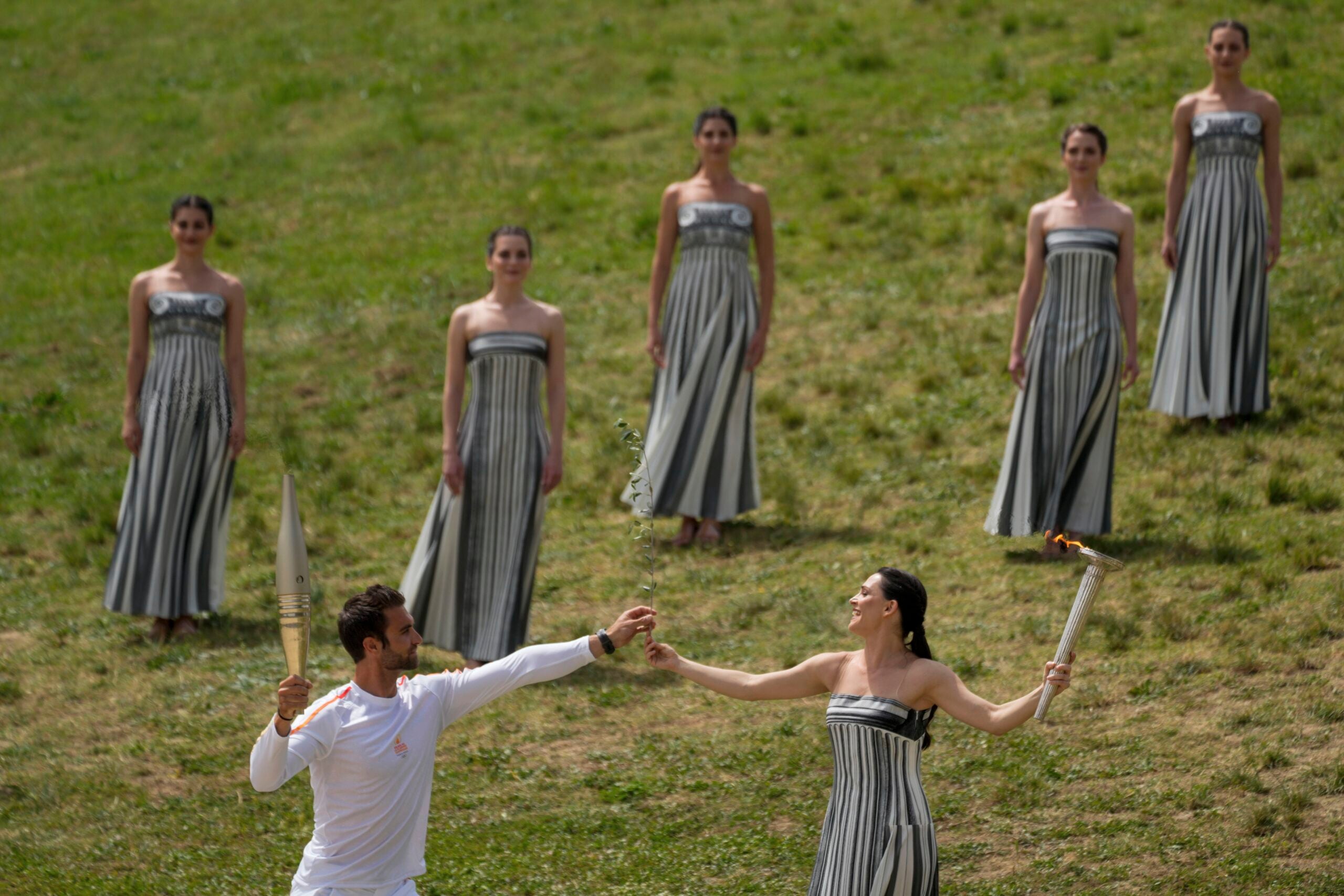 From the ancient stadium in Olympia, a relay of torchbearers will carry the flame along a 5,000-kilometer (3,100-mile) route through Greece, including several islands, until the handover to Paris Games organizers in Athens on April 26.