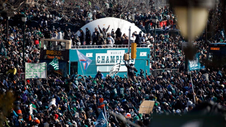 Thursday’s parade was tame in comparison to impromptu celebration that broke out Sunday after the Eagles’ defeated the New England Patriots 41-33. In the hours after the Super Bowl victory, fans overturned a car, shattered storefront windows, ate horse feces, collapsed a hotel’s awning and hit the police commissioner in the head with a bottle.