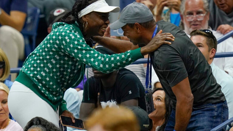 Woods was in Williams’ guest box at sold-out Arthur Ashe Stadium, two seats over from her sister, Venus.