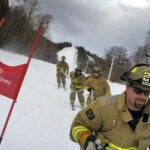Firefighters hit the ski slopes at Sunday River in full gear, and with hoses
