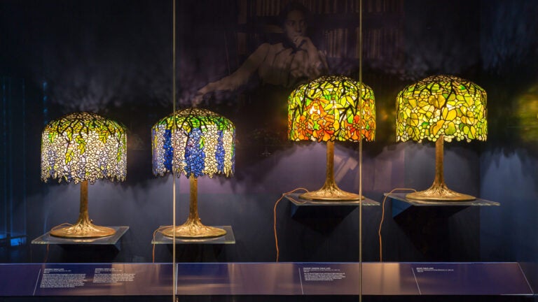 Curated by the Museum’s Margaret K. Hofer, assisted by Rebecca Klassen, the gallery is filled with illuminated Tiffany lamps in a variety of sizes and styles — floor, hanging, desk — all with the distinctive opalescent glass shades developed by Louis Comfort Tiffany during his company’s heyday (1898 to the mid-1920s). The lamps were individually handcrafted by a team of artisans at the company facility in Corona, Queens, which is documented by period photographs.