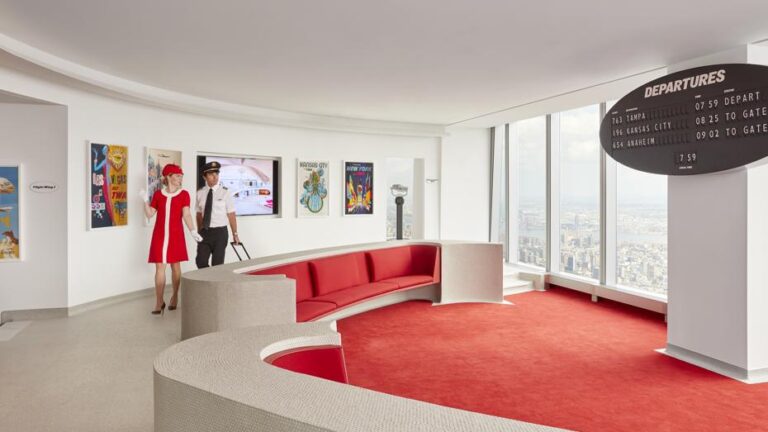 For those who can’t wait for the hotel, the One World Trade Center lounge offers a taste of Saarinen’s legendary sunken lounge in miniature, complete with the chili pepper-red carpet. The World Trade Center TWA lounge channels Saarinen’s iconic 1962 terminal with rounded walls to mirror the curved design of the world-renowned architect’s flight center. A reception desk and analog departures display were also constructed to recall the mid-century aesthetic. Banquettes face floor-to-ceiling windows, while a telescope points directly at the under-construction TWA Hotel at JFK in Queens.