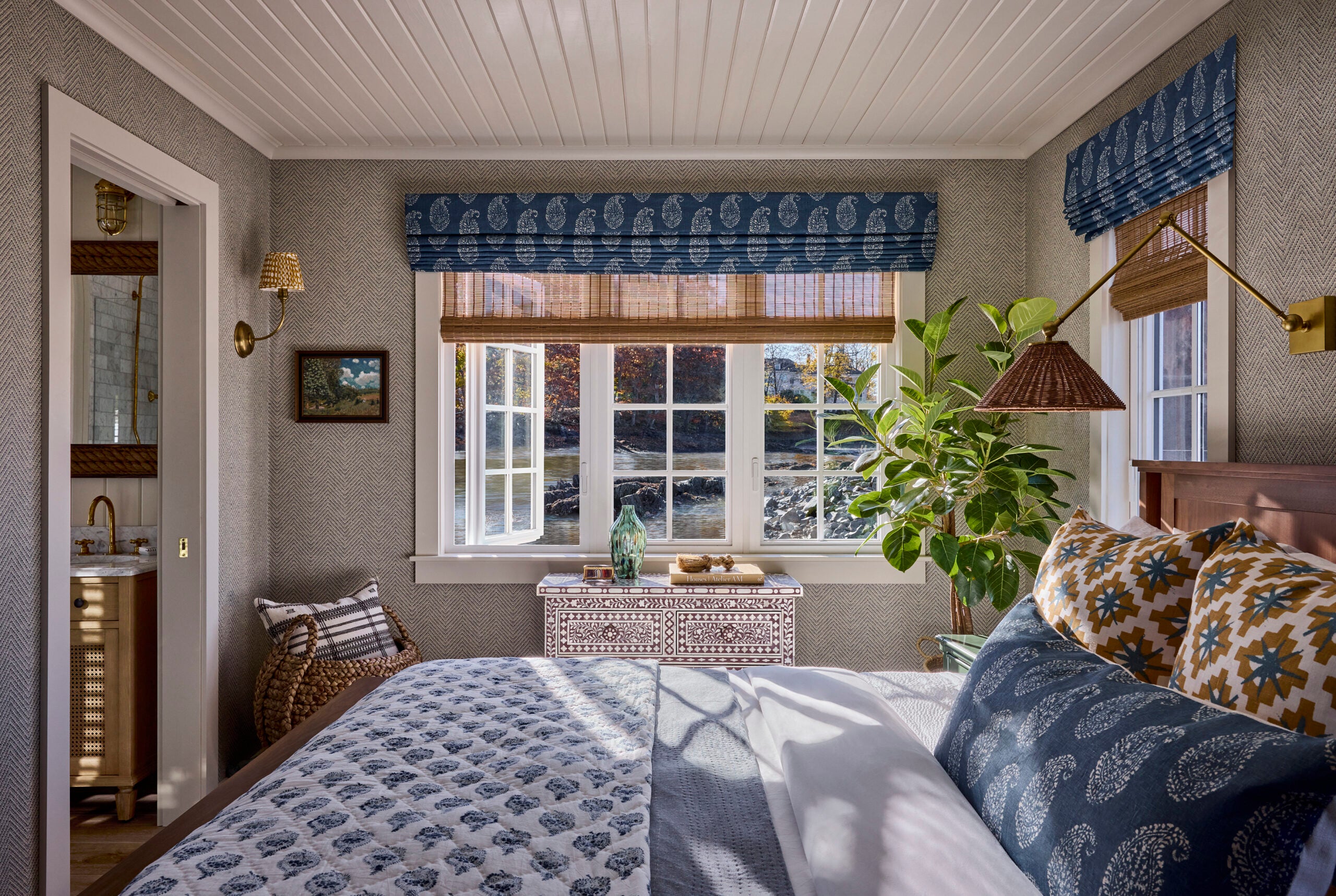 Guests will discover wide plank flooring, neutral walls, bamboo window shades, classic ticking and stripes, modern batiks, warm walnut finishes, and a color palette of teal, deep blue, and green, with touches of yellow.