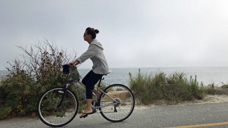 The scenery unfurls immediately, as the bike path weaves through greenery (with peeks of water) to a gorgeous stretch of Surf Drive Beach. Look across Vineyard Sound for views of Martha’s Vineyard. On the beach, there’s a series of cairns (stacked rocks), constructed by beach-goers. On the other side of the trail are wetlands and oyster ponds.