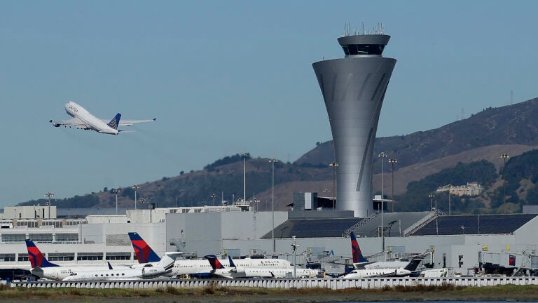 FILE - In this Oct. 24, 2017, file photo, the air traffic control tower is in sight as a plane takes off from San Francisco International Airport in San Francisco. Federal authorities have determined most of the close-calls reported since December 2016 at the busy San Francisco International Airport were caused by pilots. The East Bay Times reports Wednesday, May 2, 2018, the Federal Aviation Administration found that in three instances planes lined up for wrong runways and taxiways due to pilot error. A fourth plane was mistakenly cleared to land in the wrong runway by a tower controller.(AP Photo/Jeff Chiu, File)' Jeff Chiu / AP, File