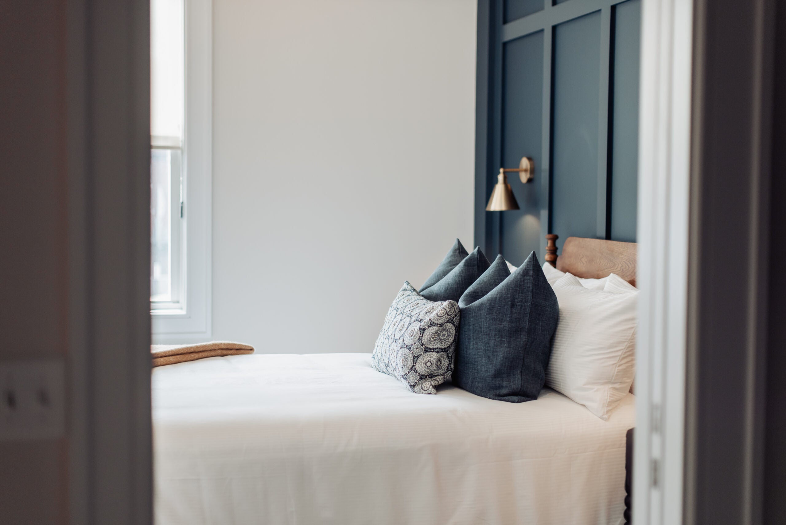 The modern, New England-style rooms feature soft coastal hues, custom furnishings, and king and queen beds.