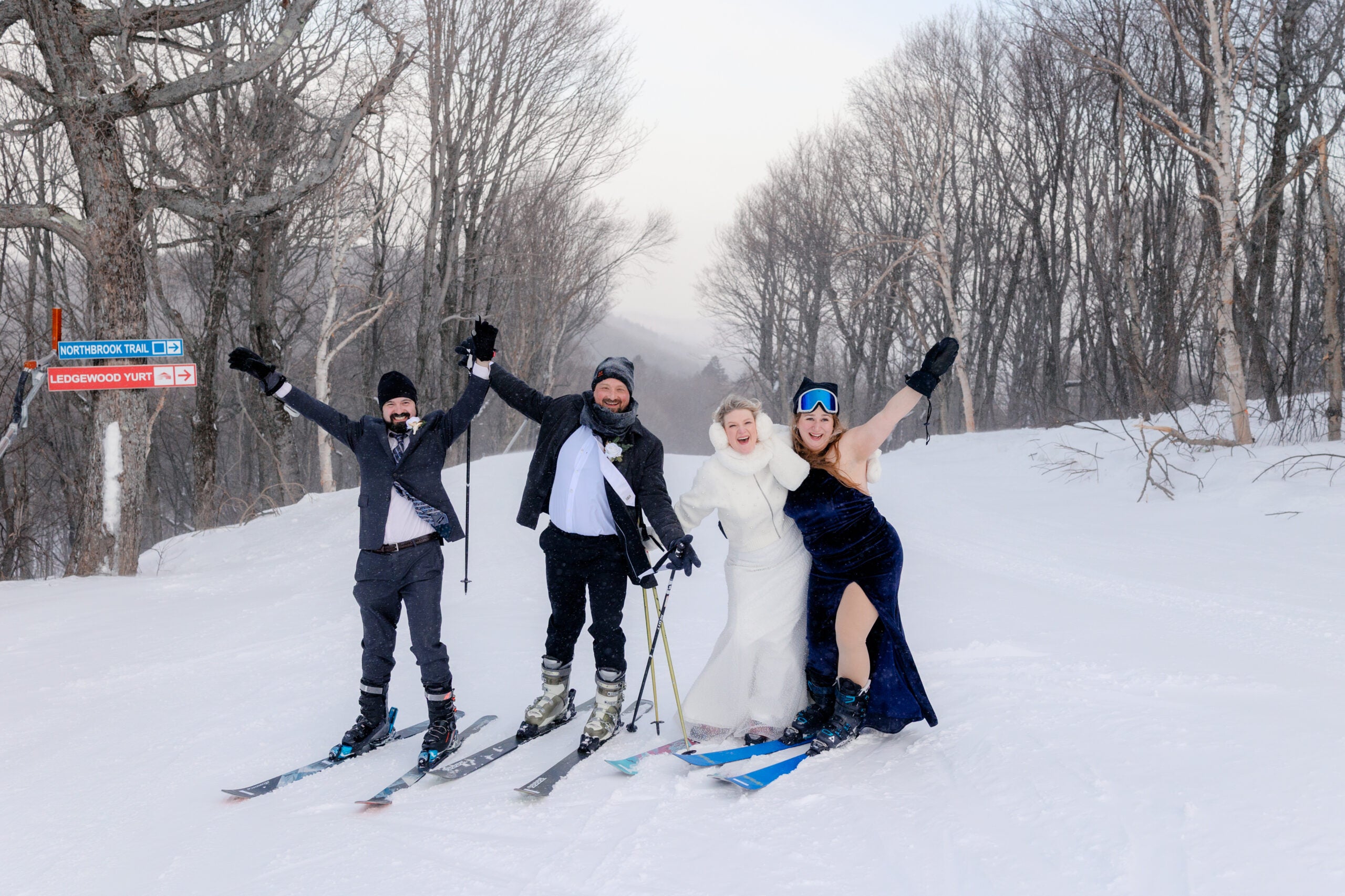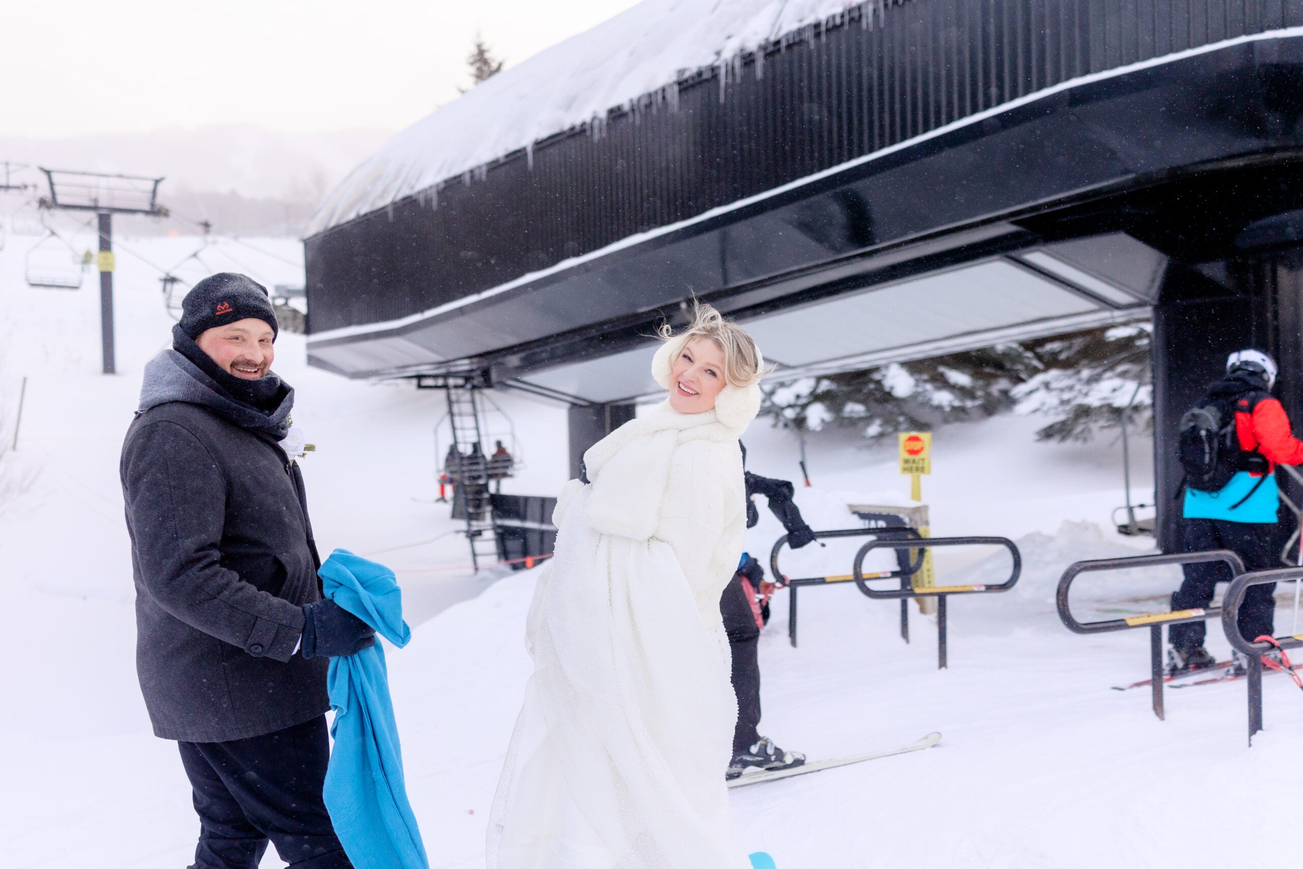 The indoor ceremony took place on site and was performed by a friend. It wrapped up at around 3:30 p.m., and the chairlifts stopped spinning that day at 4 p.m. So the couple hustled to a prep room where they quickly put on their ski equipment.