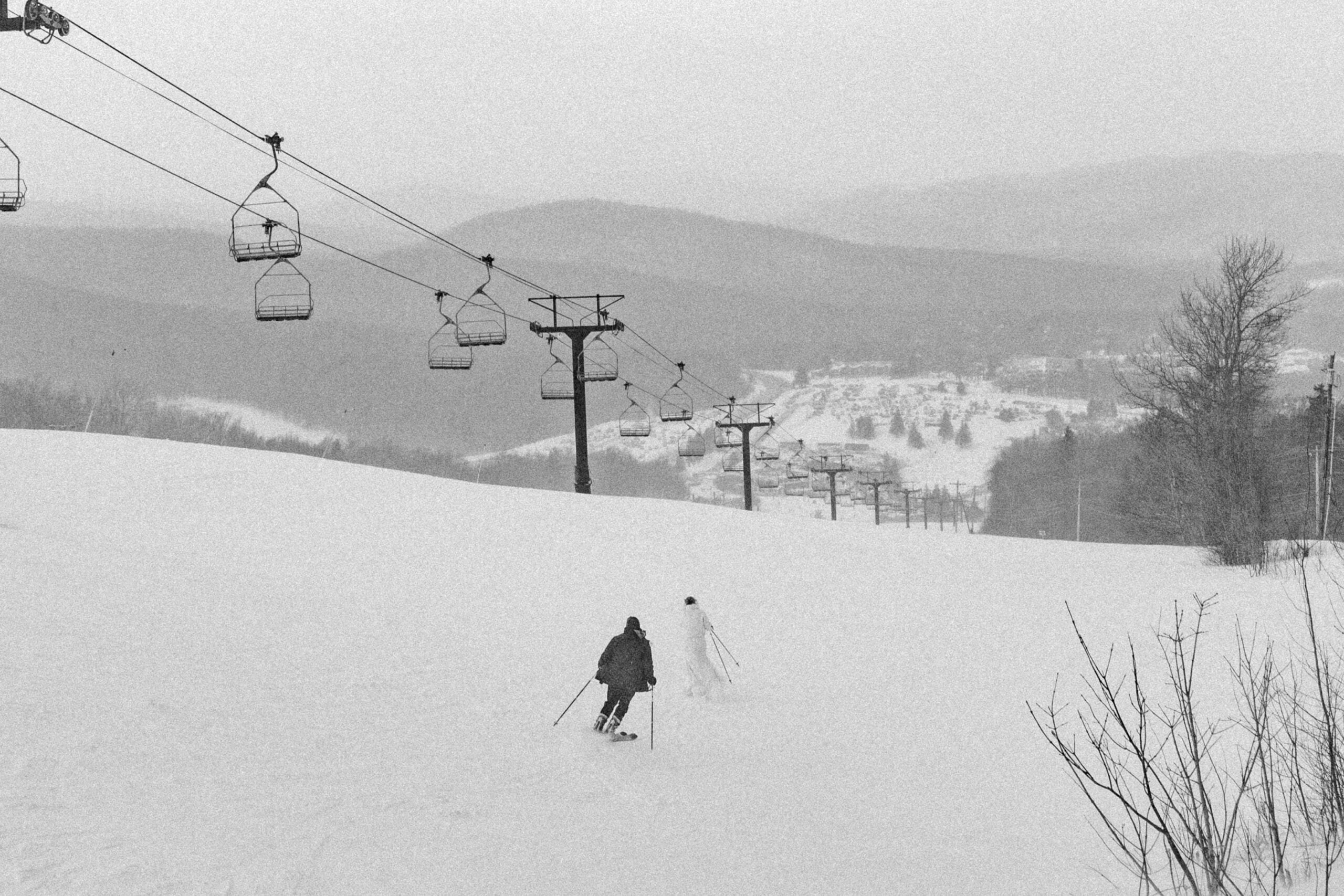 Evan Stark and Kristyn Brophy Stark skiing Killington on their wedding day. Anne Mientka Photography